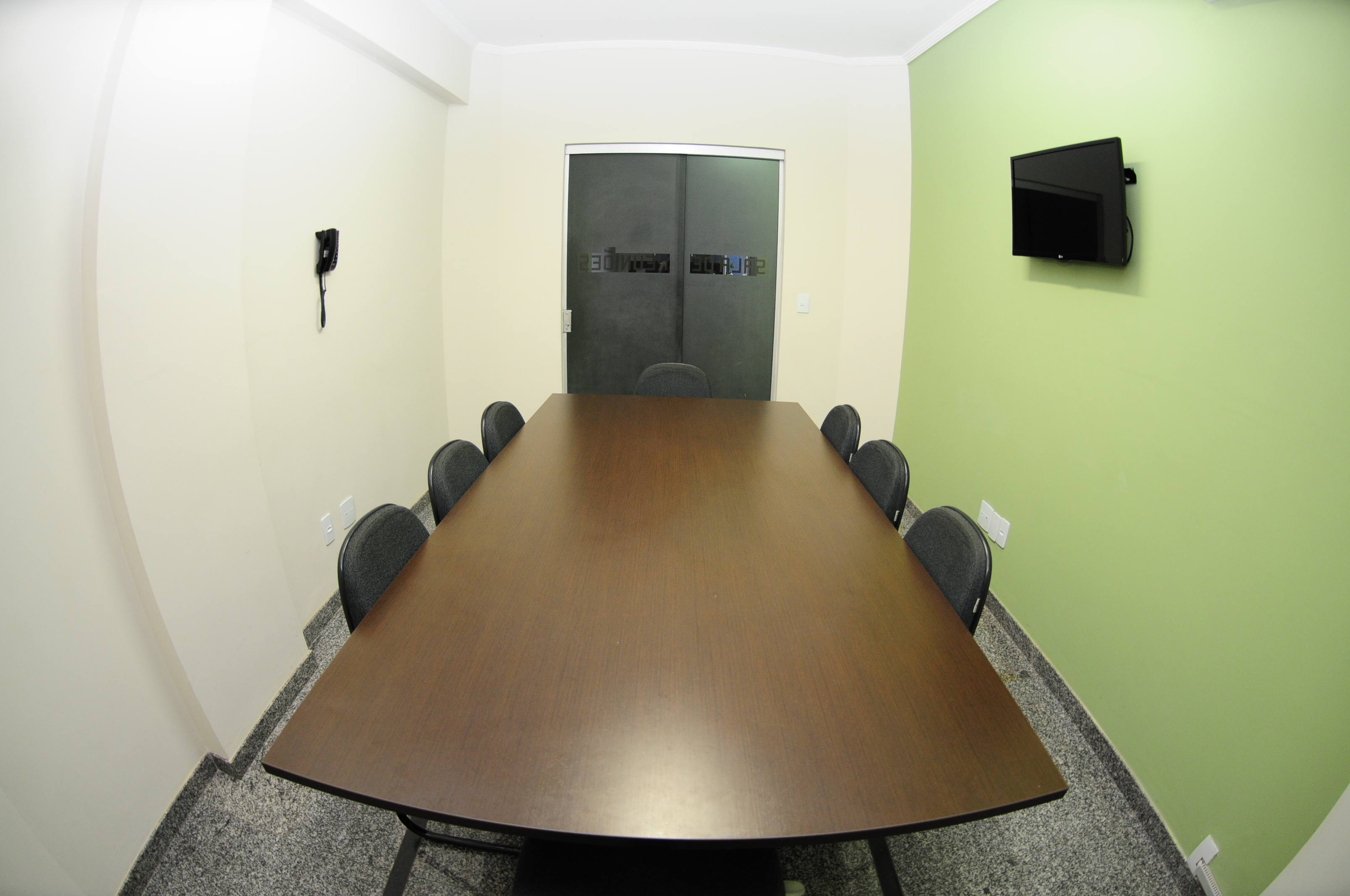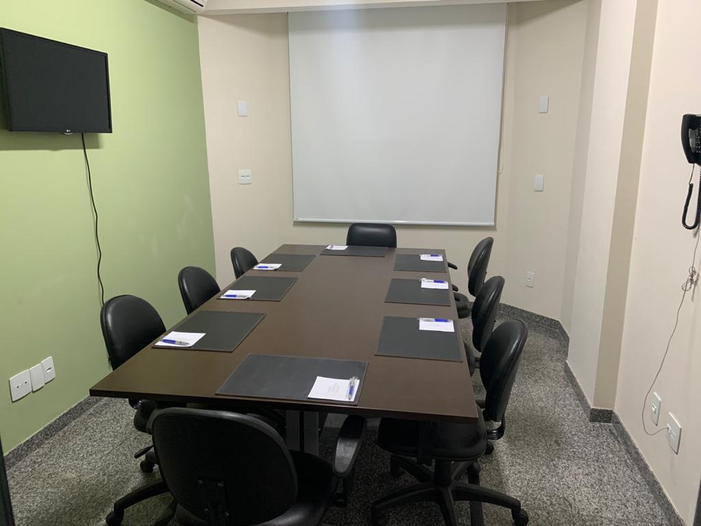 ideal para reuniões de até 8 pessoas com mesa retangular, Área de 12m² e 2,90 m² pé direito, TV LCD 32” para projeção via HDMI, Wifi e ar condicionado.